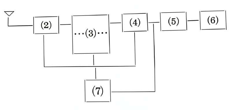 まず受信機は七球にすることにした。受信方式は⑴スーパーヘテロダイン受信とした。⑵高周波増幅をしたあと、⑶周波数変換をし⑷中間周波増幅をし⑸検波をする。そして最後に⑹低周波増幅してスピーカーを鳴らせることにした。その間に⑺マジック・アイ・⑻Sメーターなどを入れることにした。これをブロックダイヤグラムにしてみると、